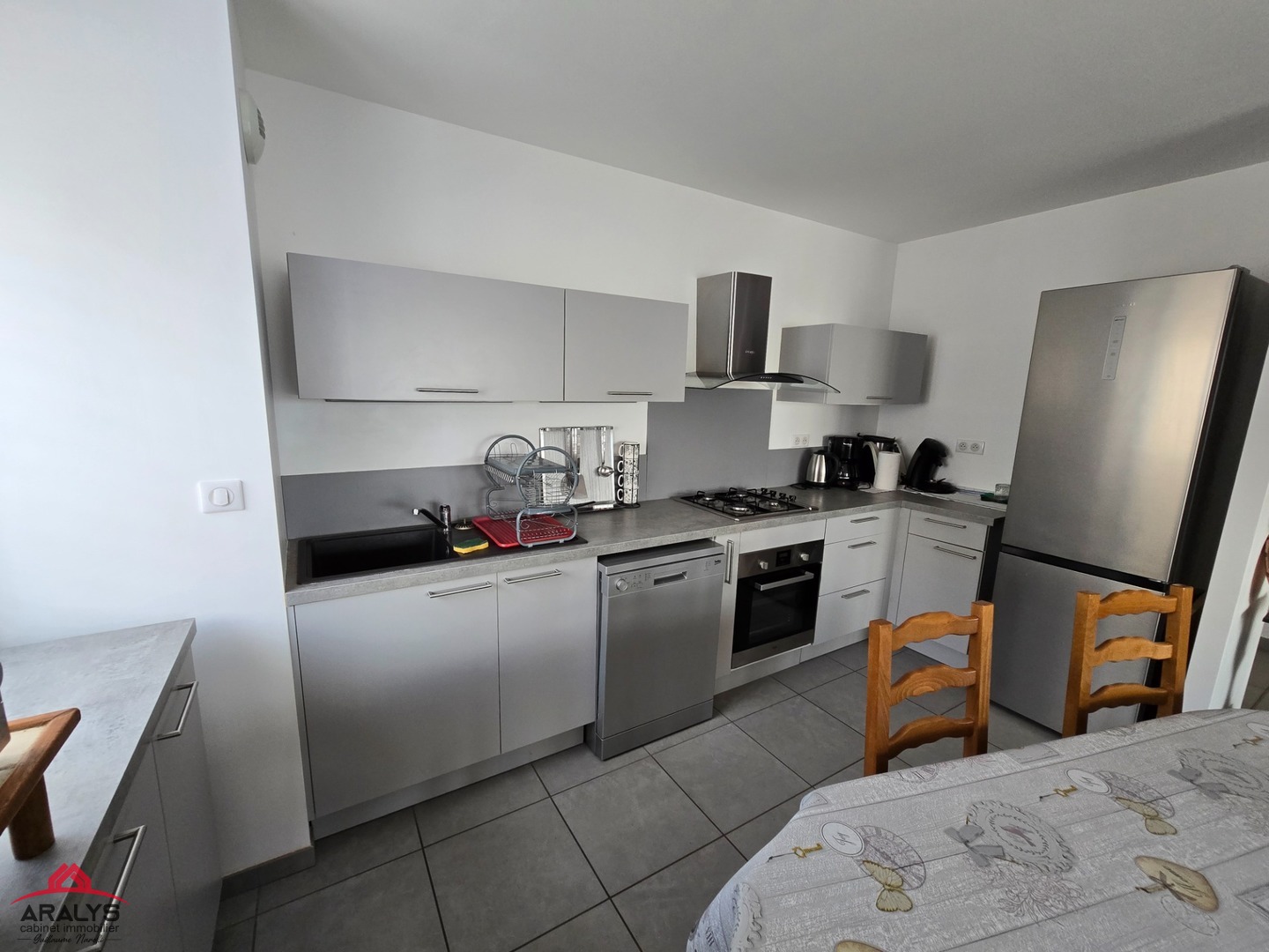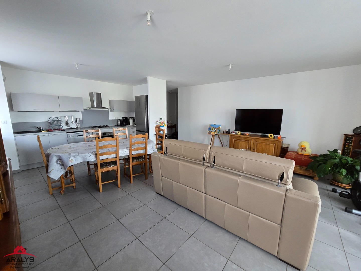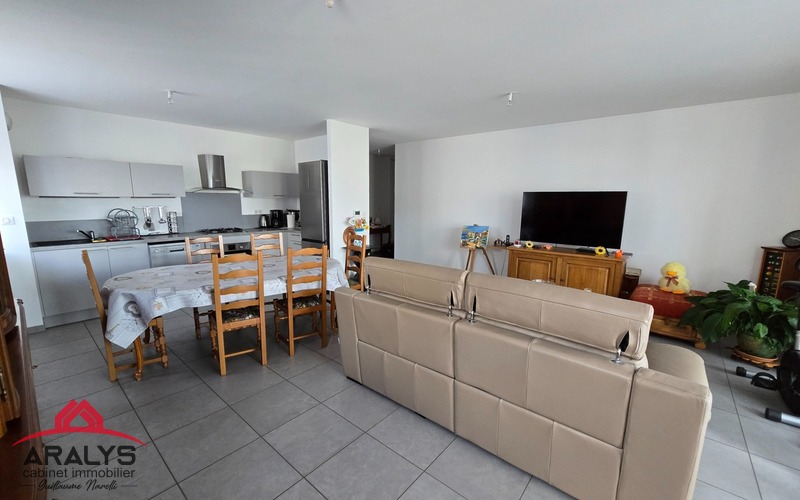 Hall d'entrée, double salon séjour avec cuisine équipée de 36 m² donnant sur grande terrasse abritée, 2 chambres avec placards, salle de bains et wc séparé, cellier.
