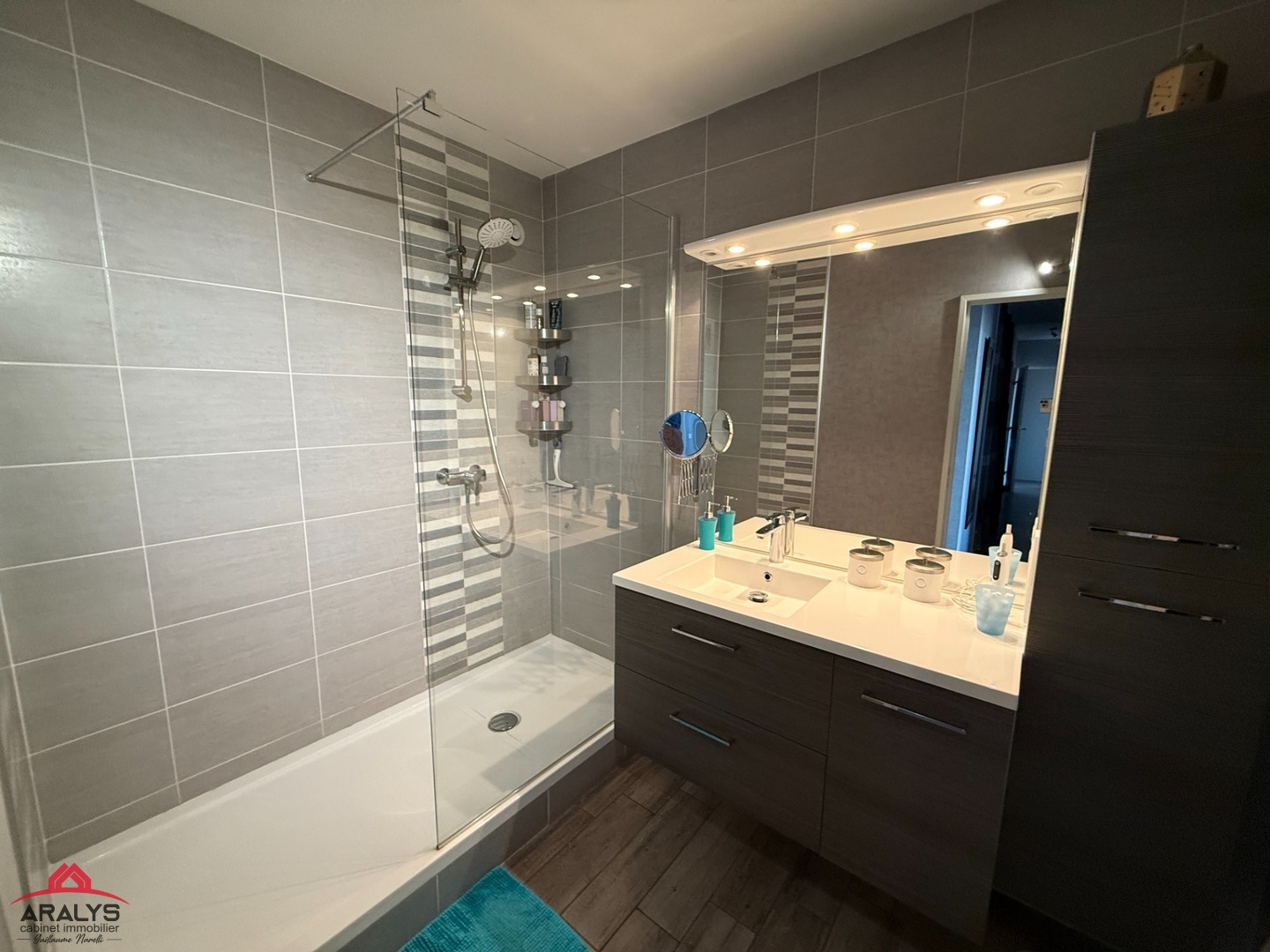 Une salle d'eau avec douche et meuble vasque + miroir contemporaine.