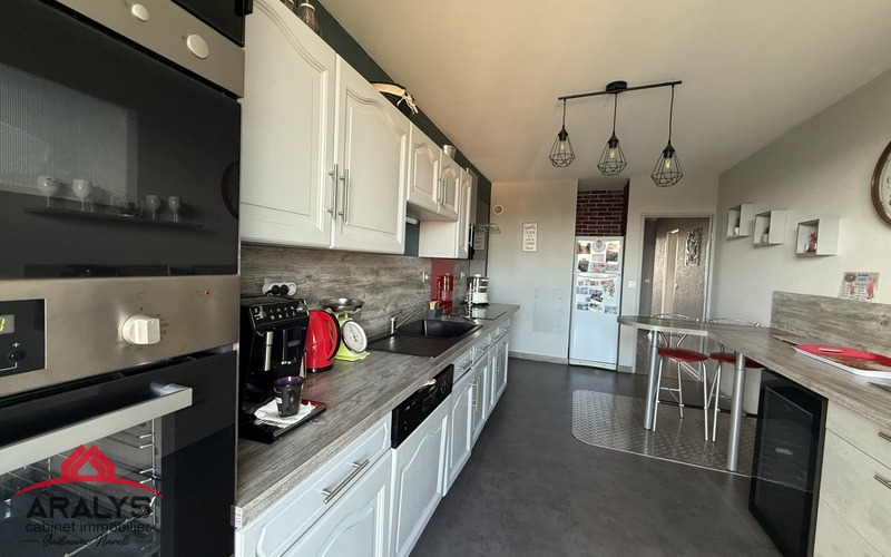 Grande cuisine équipée de 15 m² avec porte fenêtre sur balcon.