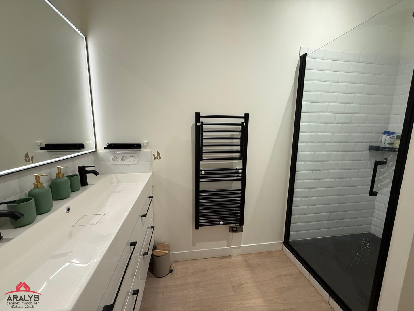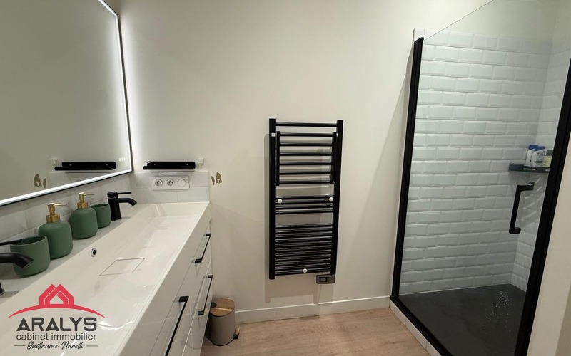 Il dispose également d’une très jolie salle d’eau moderne, équipée d’une douche à l’italienne, d’un meuble vasque avec double robinetterie, ainsi que d’un emplacement pour machine à laver.