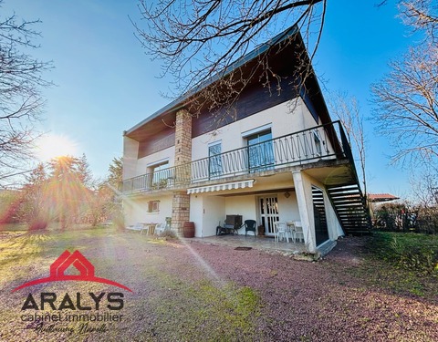 LE CABINET ARALYS IMMOBILIER VOUS PRESENTE Belle maison d’environ 170 m² avec un grand terrain arboré de 3000 m². Maison d’architecte construite en 1974, semi -enterrée. Quelques marches vous conduiront à l’ensemble de la maison, composée d’une cuisine équipée, un grand salon séjour de 60 m² avec sa cheminée et l' accès sur la terrasse, trois chambres dont une suite parentale (12, 13, 16 m²), une salle de bains et un toilette. Une...
