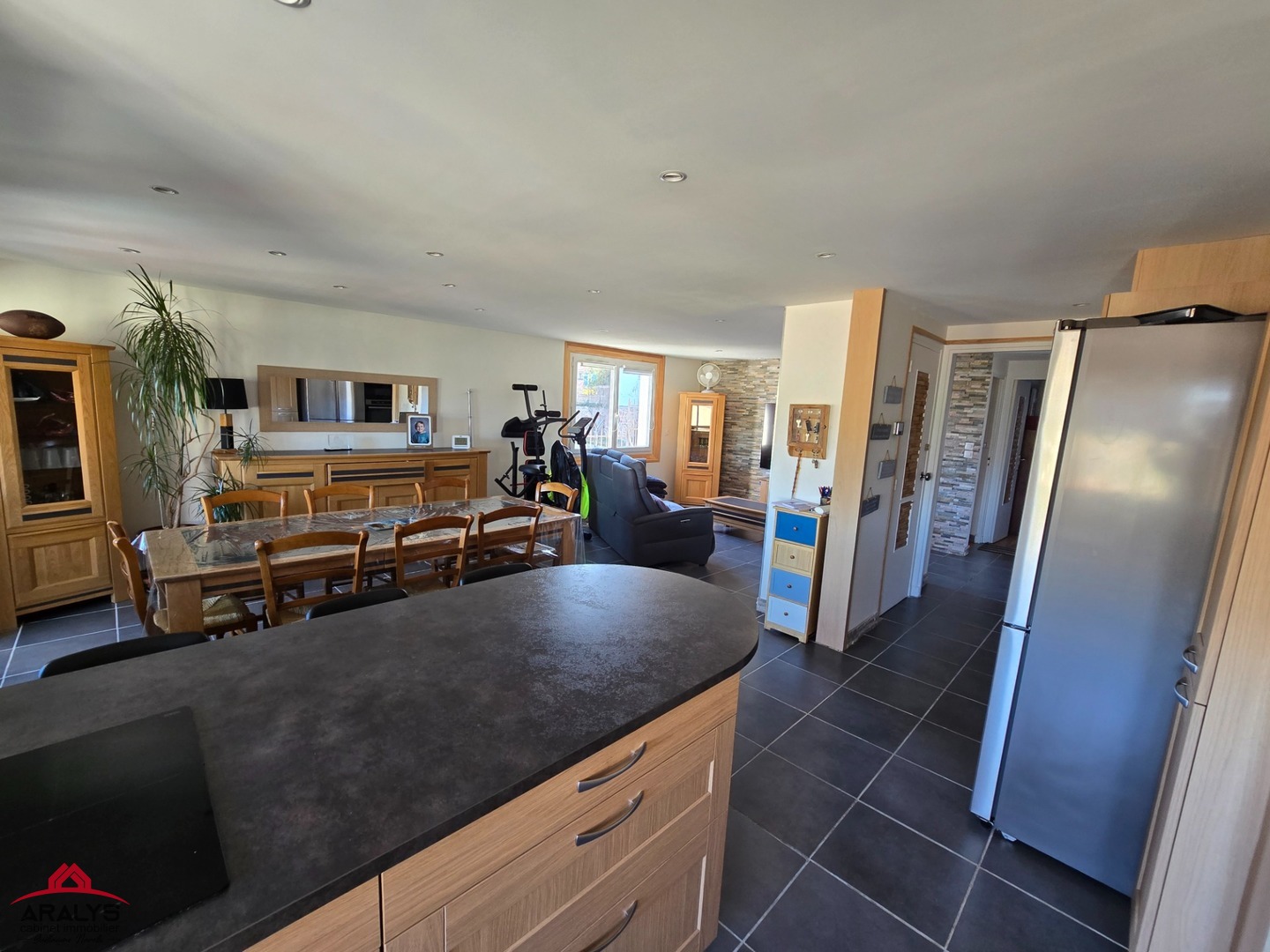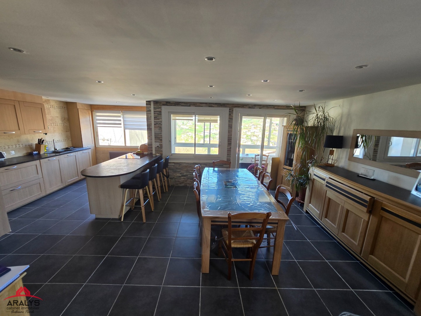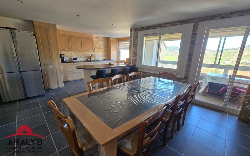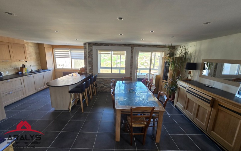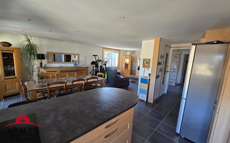 Belle espace de 100 m² comprenant cuisine de cuisiniste très récente avec son espace bar pour déjeuner ouverte sur salle à manger et salon de 55 m²