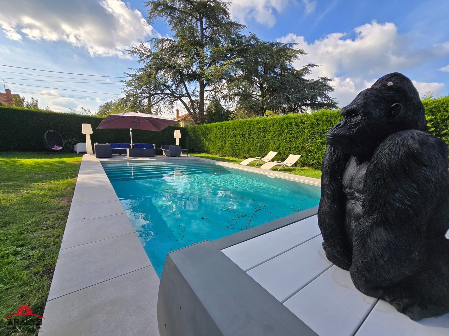 Une piscine récente, équipée d’un rideau électrique de sécurité enfant