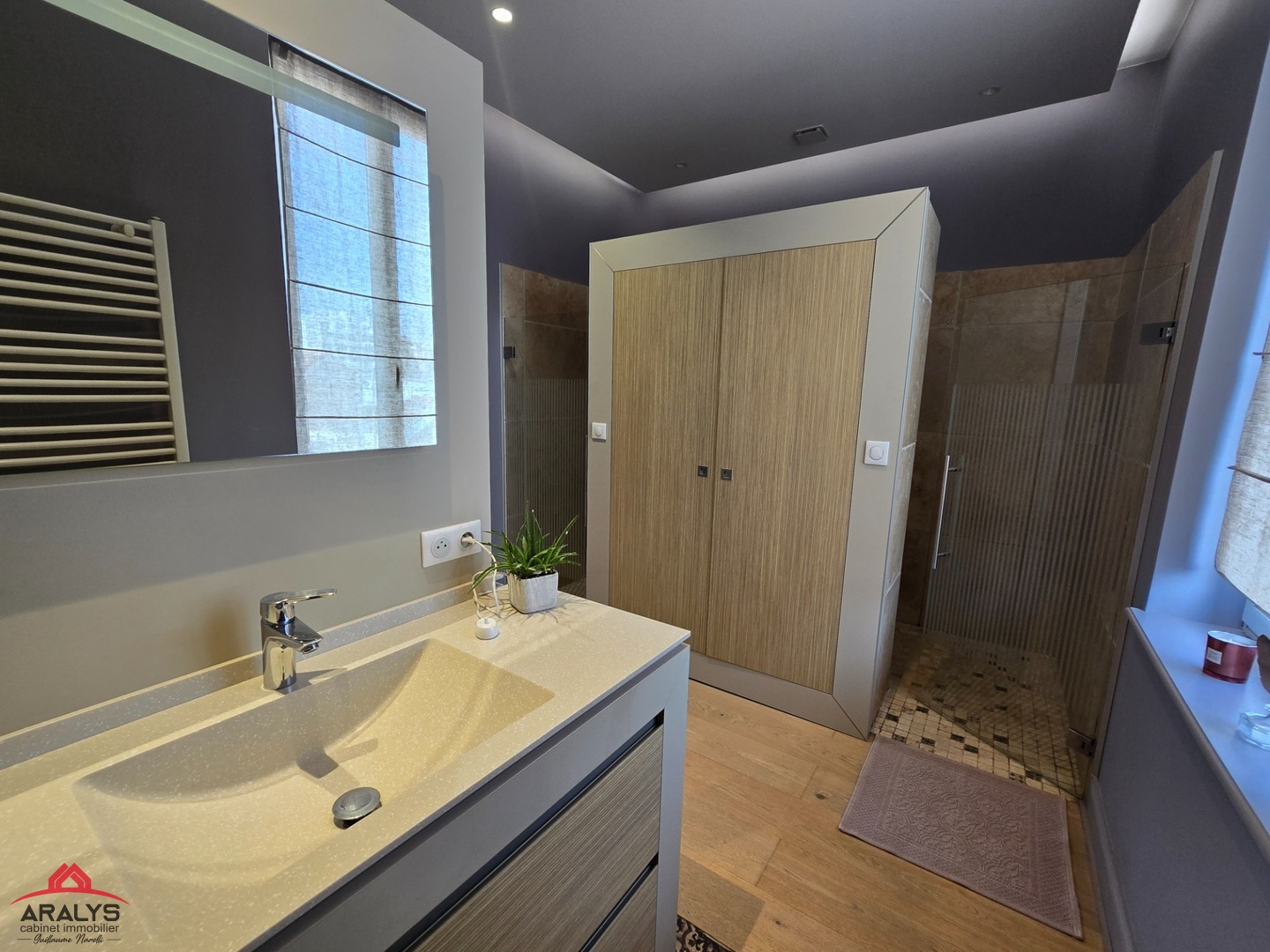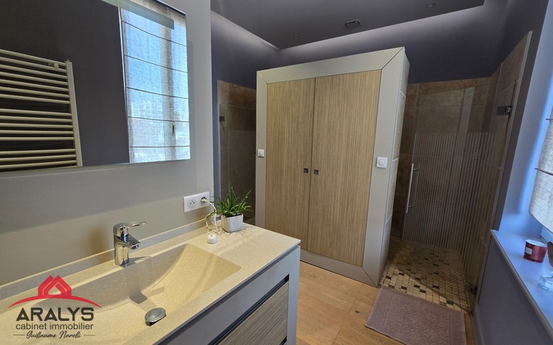 Avec l’espace lit / le dressing sur mesure avec coin Monsieur/ Madame et la grande salle d’eau offre une double douche et double vasque avec fenêtres et rangement