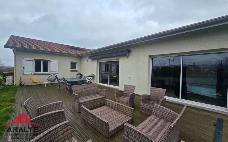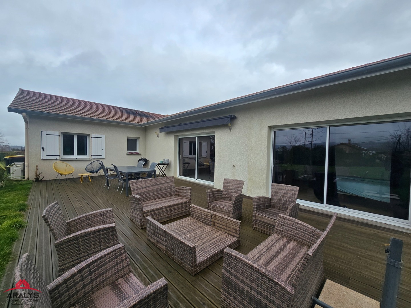 Une grande baie vitrée donne accès sur une spacieuse terrasse en bois et vue côte Roannaise